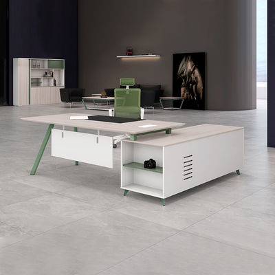 L shape office desk with long size cabinet, Including one wire box, V shape aluminum handle, soft clossing hinge